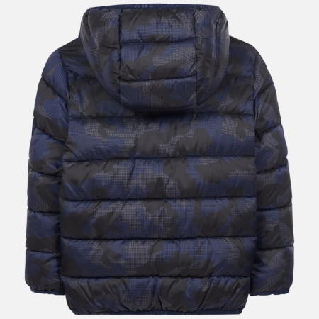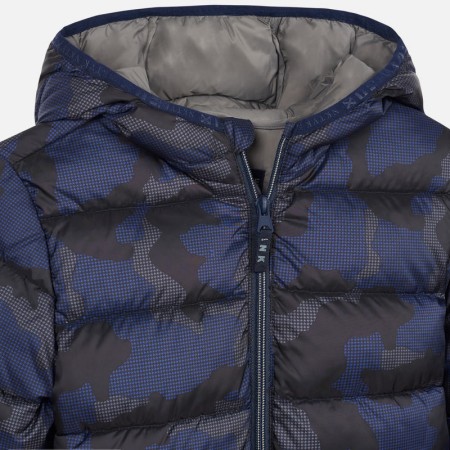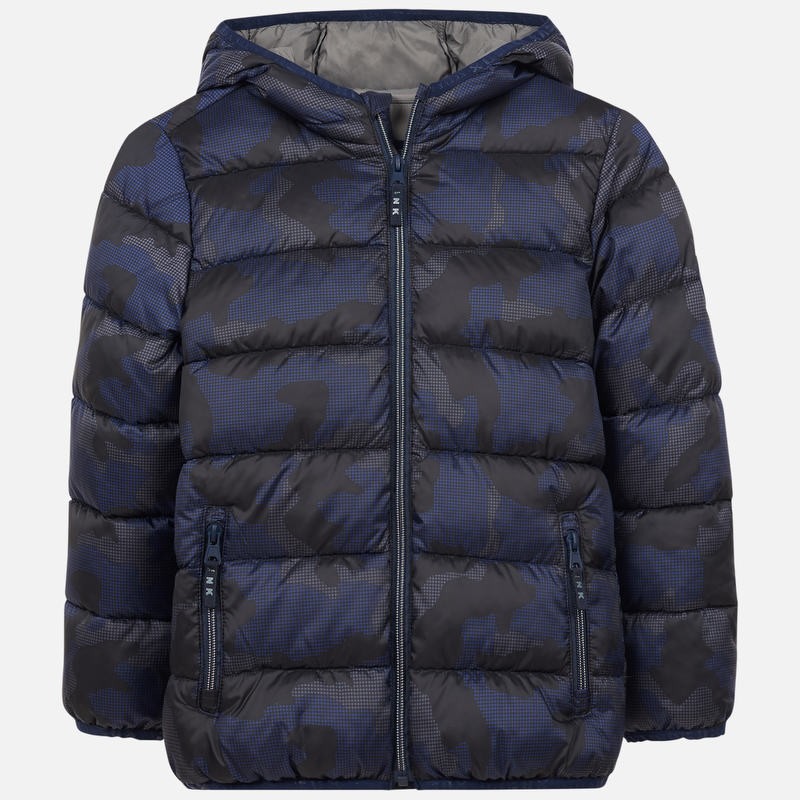 Zimska prošivena ispunjena jakna za dečke. S kapuljačom i uzkim patentom na rukavima. Ravan kroj. Prednji džepovi. U vojnom printu. Pored jakne manja vrećica u koju se može pospremiti jakna ili osnovni predmeti.