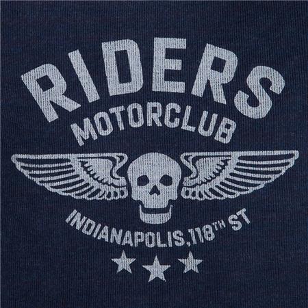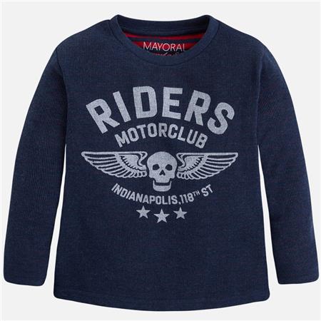 Majica za fante v temno modri barvi. Potiskana je z napisom Riders Motoklub. Je iz 100% bombaža. Lahko se jo nosi tudi kot lahek pulover.