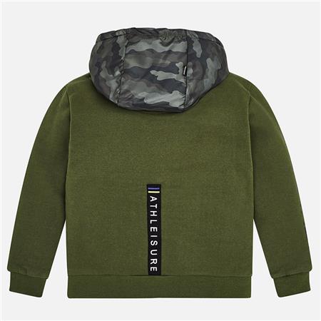 Čudovit kapucar za fante v temni, olivni zeleni barvi. Kapuca je v vojaškem potisku in del dvojne zadrge tudi.