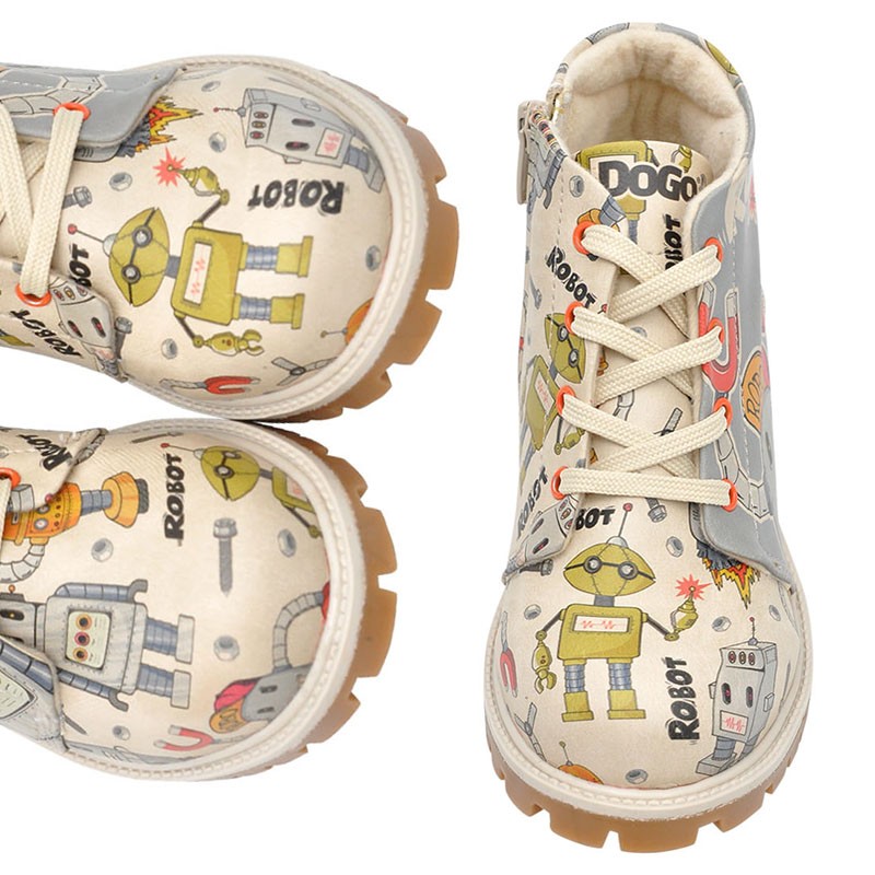 Topli potiskani piščančki za punce DOGO so idealni za vreme, ki prihaja. Gležnjarji so potiskani v norih, unikatnih potiskih, kjer sta skoraj vedno levi in desni čevelj si različna. Topla bombažna podloga je mehka, flisasta. Pri strani imajo zadrgo in zavezujejo se na vezalko. Sintetično usnje je izjemno mehko in prijetno za nositi. če želite še dodatno podložiti piščančke, lahko vstavite volnen vložek.