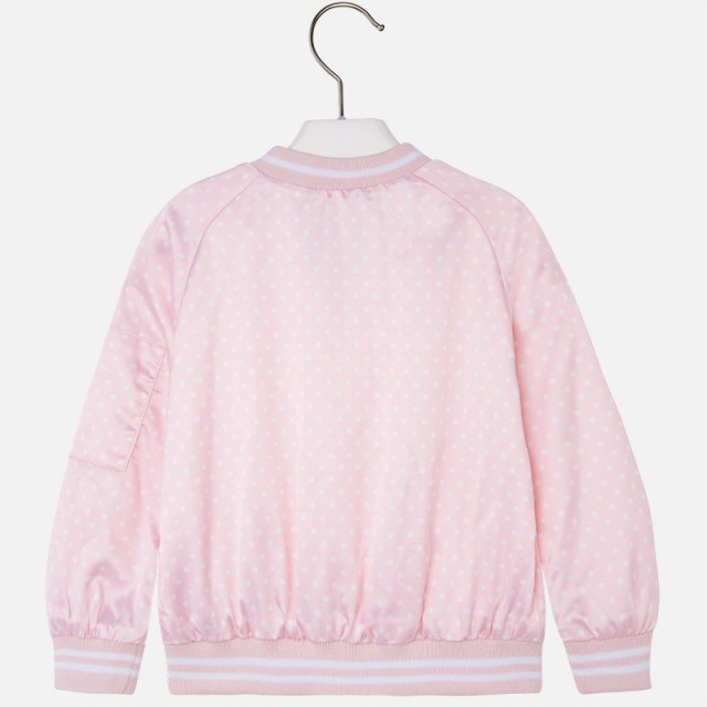 Prehodna jakna v bomber stilu za punce je v nežno roza barvi z belimi pikami. Na rokavih in v pasu je patent, prav tako na ovratniku. Zapenja se na zadrgo, ki je skrita in je v bakreni barvi. Ima dva žepa na pritiskače in pa mali žepek na zadrgo na rokavu. Jakna je dovolj tanka, da jo punce lahko nosijo celo sezono.