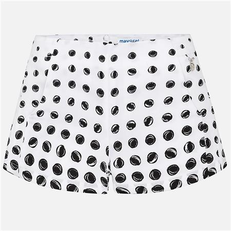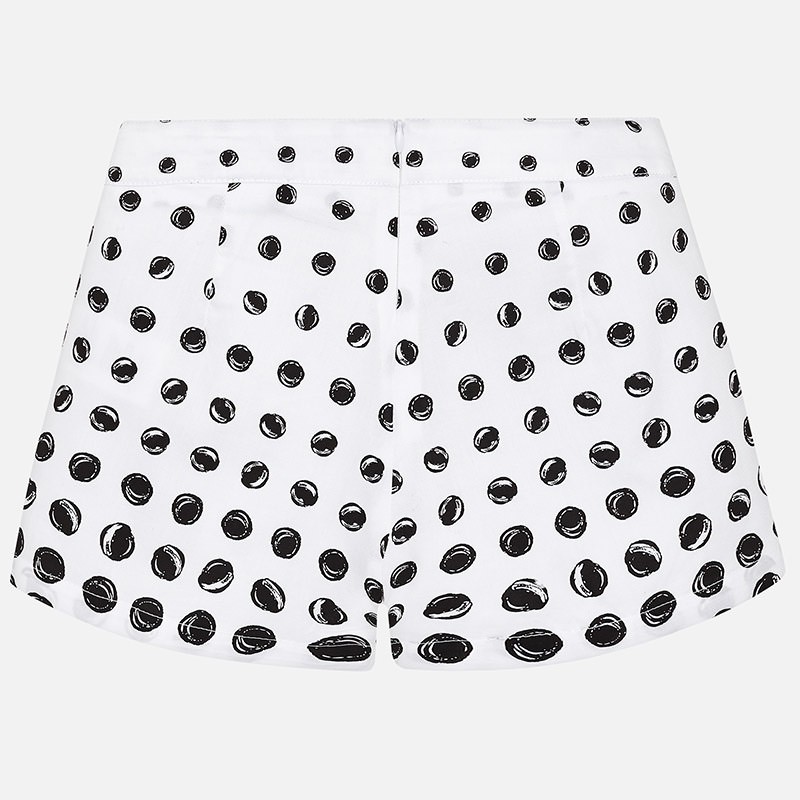 Poletne, lahke kratke hlače za punce v beli barvi s črnimi pikami. spredaj sta dva žepa, ki se ju skoraj ne opazi. Hlače so iz bombaža in so zelo lahkotne. So brez zunanjega pasu in imajo notranje nastavljiv pas.