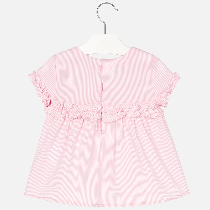 Lahka poletna bluza za punce je širše krojena, da lepo pade. Blago je črtasto v roza-beli kombinaciji. Na rokavih in pod prsmi je nabrana. Zadaj se odpira na netke. Odlično jo lahko kombinirate z jeansom.
