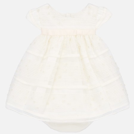 Čudovita obleka za svečane priložnosti v slonokoščeni beli barvi ima kratke rokave in okrogel ovratnik. Zgornji del se lepo prilega telesu. Narejena iz plumeti prosojne tkanine s pikicami in vodoravno vezenimi črtami. Pod obleko je dvojna podloga iz 100% bombaža. Dodane so bombažne hlačke za čez pleničko. Zadaj se obleka odpenja s skrito zadrgo.