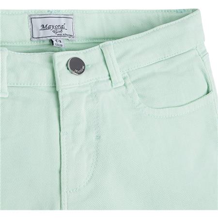 V basic ponudbo Mayoral poletne kolekcije spadajo tudi te kratke hlače za punce v nežno zeleni barvi. Zelo enostaven kos oblačila, a vseeno zelo priljubljen med dekleti. Hlačnici sta privihani, pet žepov, zapenjanje na gumb in zadrgo. Ker vsebujejo elastan, se odlično prilegajo vsaki ritki.