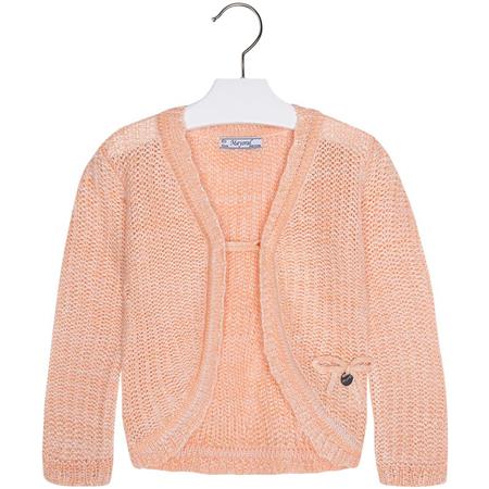 Pletena jopica za punce v marelični barvi. Spredaj je rezana na okroglo, na sredini ima skriti gumbek in zanko, da se jo lahko zapne. Pri strani pa okrasna mašna.