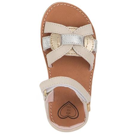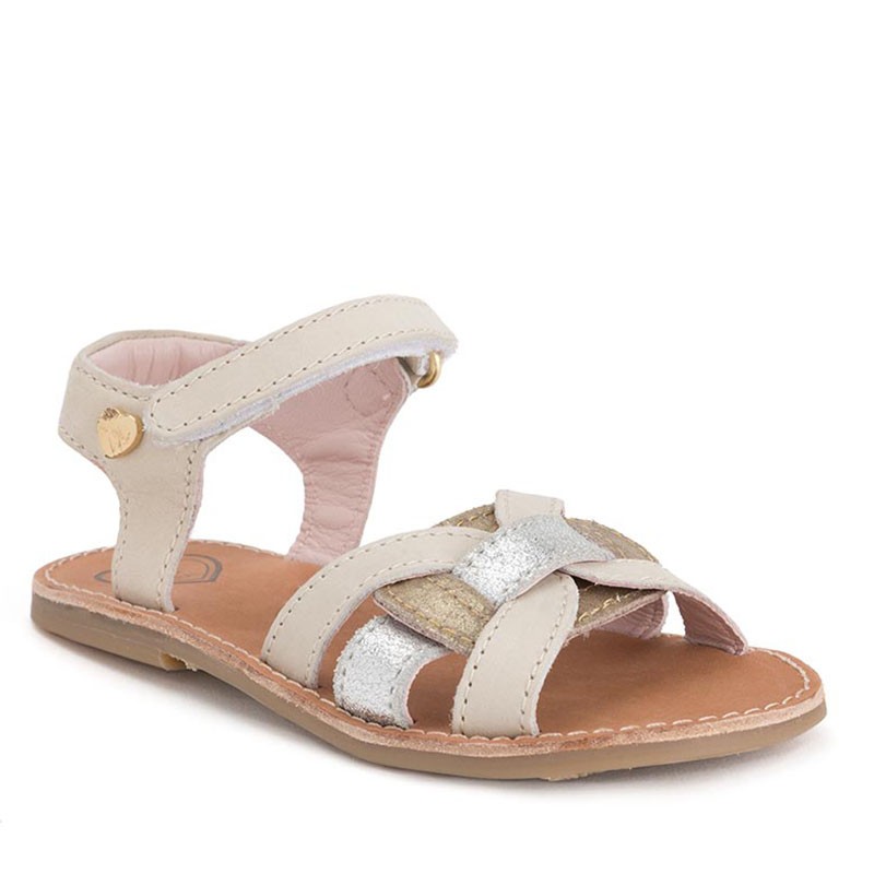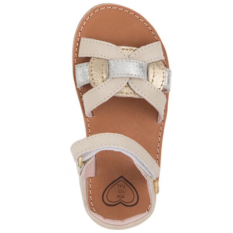 Mayoral je za punce naredil še en model usnjenih sandal...tokrat v nežno krem barvi. Spredaj, nad prsti, so prepletene tri zemeljske barve - bež ter srebrna in zlata. Pašček je na ježka in se zapenja pri gležnju. Področje narta je prosto, tako da punce, ki imajo višji nart, lahko mirno nosijo te sandale. Nežne barve pa poskrbijo da se vse barvne kombinacije ujamejo s sandali.