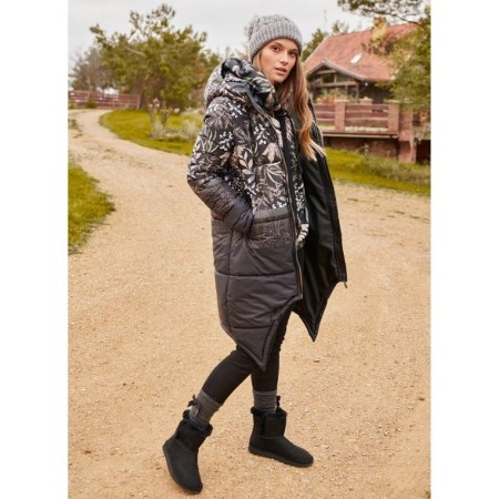 Topla, daljša zimska bunda v zimski kombinaciji barv. Vzorec z elementi narave v kombinaciji z skrivnostno črno. Kombinacija, ki je osvojila naša srca na prvi pogled! Krojena je drugače, kot običajne bunde; spredaj ima polkrožen izrez, ki omogoča neovirano hojo. Bunda je izolirana, zapira se z zadrgo, ima dva prostorna žepa in veliko kapuco, ki vas bo zaščitila pred vetrom.