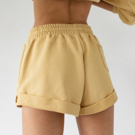 Bombažne ženske kratke hlače z visokim pasom in ohlapnimi hlačnicami, rahlo privihanimi na koncu. Imajo elastiko v pasu in vezalke za zavezovanje . Spredaj imajo dva žepa, zadaj enega.