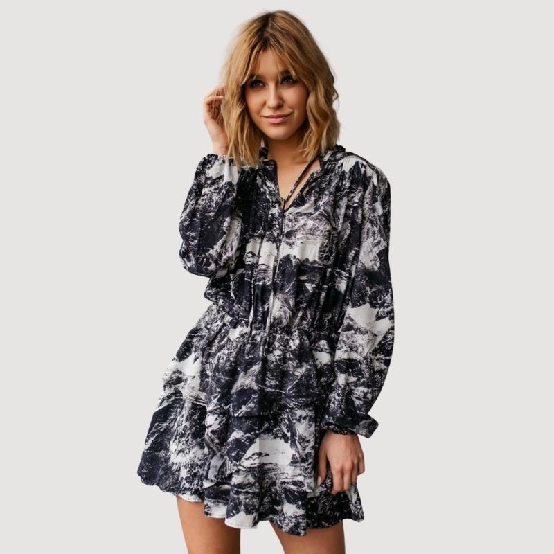 Obleka za ženske je narejena iz gladke in nežne 100% viskoze. Obleka ima dolge, ohlapne rokave, zaključene z elastiko. Nastavite si jih po želji. Izrez v obliki črke V z vezavo in okrasnim stoječim ovratnikom.
